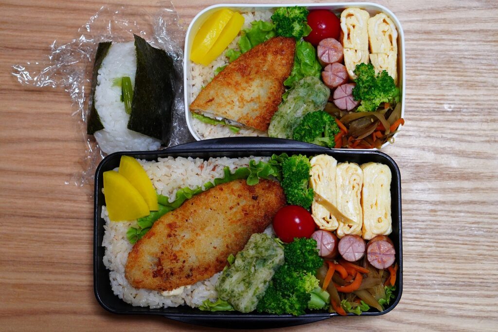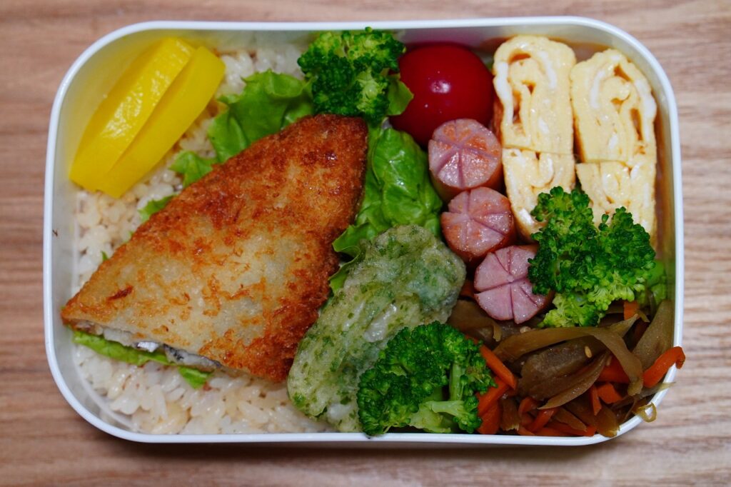 この前まとめ揚げしておいた白身魚フライが、まだ冷凍庫に沢山ストックされているので今日は海苔弁にする。と言いつつ、ごはんの上に海苔を敷くのを忘れたのに今、気がついた。