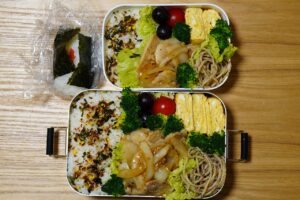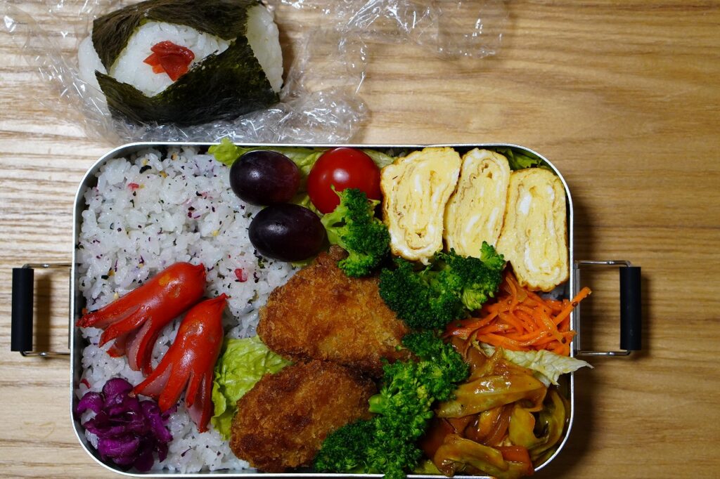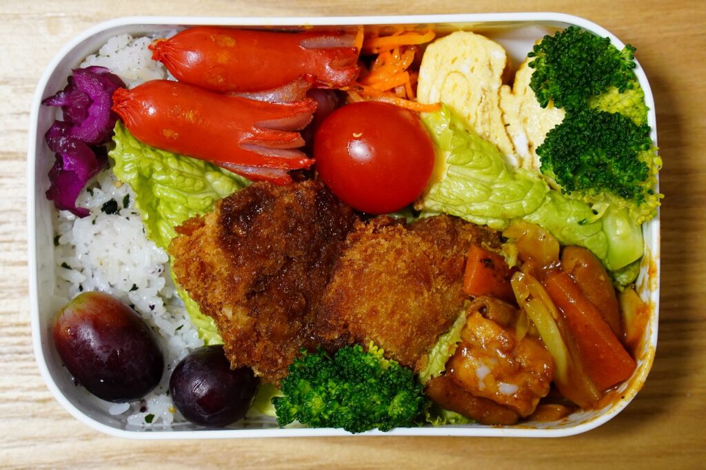 今日のメインはヒレカツなんやけど、冷蔵庫の残りもの(こてっちゃんの炒めもの、人参しりしり)も入れたら、入り切らんくらいになってしまった。