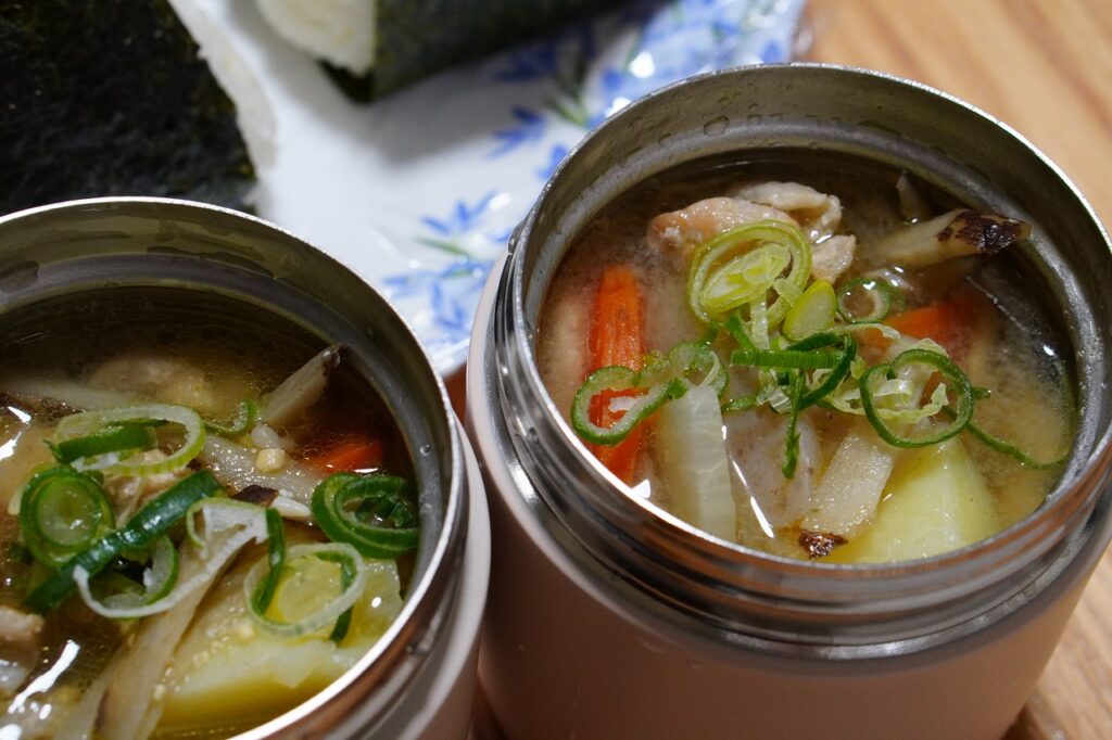 そういう訳で念願?のスープジャーを購入し、何を作るか迷ったが、最初はシンプルに汁物が良いかと思い豚汁を作る事にした。具だくさんなので、コレにおにぎりがあれば昼飯には十分だろう。