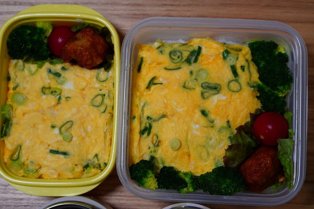 玉子はもっとふわふわに出来たけど、弁当なので半生はマズイと思いひっくり返して両面焼きにしている。見た目的にはちょっと残念だけど仕方がない。