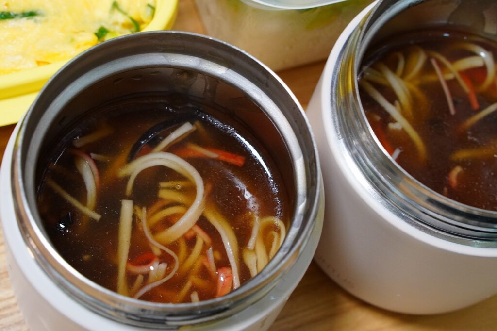 スープジャーの保温性がイマイチなようなので、今日はお湯を一度入れ替えて予熱を高める工夫をしてみた。餡にとろみもあるので、冷めにくいと思うんやけど、どうだろうか…